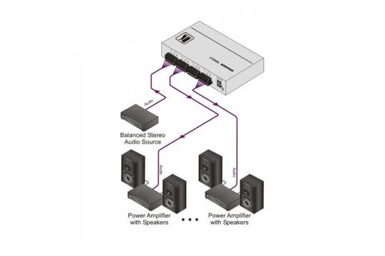 | Особенности | Усилитель-распределитель 1:3 стерео аудио; балансный сигнал, регулировка уровня |